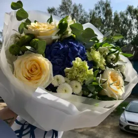 Букет с гортензией и пионовидной розой «Синяя дымка»