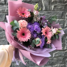 Букет «Жардин» — изящное сочетание ярких и нежных цветов, идеально подходящее для любого праздника. В его состав входят герберы и эустома, создающие красочную гамму.
