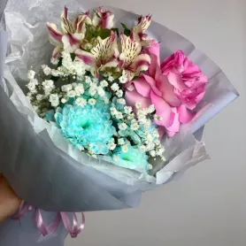 Идеально подходит для любого торжества или приятного сюрприза. Цветовая палитра и композиция радуют глаз и создают настроение. Сделайте ваш праздник особенным с помощью букета «Море».