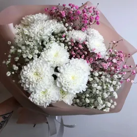 Очаровательный монобукет из кустовых хризантем и гипсофилы идеально подойдет для любого случая и станет замечательным подарком.