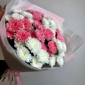 Погрузитесь в атмосферу нежности и красоты с монобукетом из кустовых хризантем.