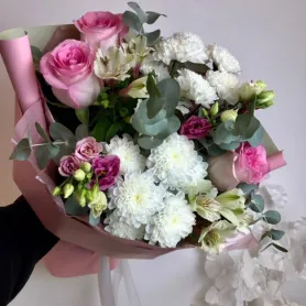 Изысканный ансамбль из эустомы, альстромерии, хризантемы и роз создает ощущение истинного счастья и умиротворения.