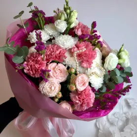 Красивый букет «Жемчужина» с диантусами станет идеальным подарком для любого повода. В его составе гармонично сочетаются хризантема, стацица, эвкалипт, эустома и кустовая роза, создавая мягкую и изысканную композицию. Этот букет подчеркнет вашу заботу и внимание, радуя глаз своим свежестью и утонченностью.