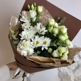 Этот изысканный букет с кустовой розой «Кофе с молоком» станет идеальным подарком для особых случаев. В его составе гармонично сочетаются эвкалипт, диантус, хризантема кустовая, эустома и роза, создавая нежный и выразительный букет. Он прекрасно дополнит любой интерьер и порадует получателя своей элегантностью.