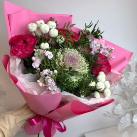 Подарите особый момент с букетом «Бенефит» — изысканным сочетанием свежих роз, хризантем и матиолы. Его насыщенные оттенки и нежная зелень создадут атмосферу уюта и роскоши.