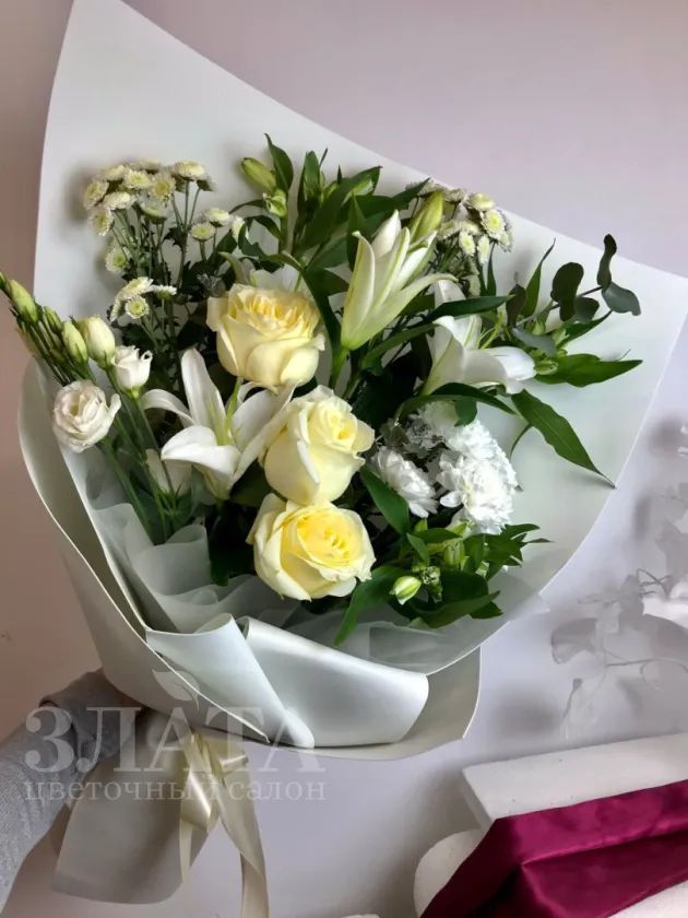 Букет «Марципан» — это изысканное сочетание свежести и элегантности, созданное из высококачественных цветов: лилии, альстромерий, эвкалипта, эустомы, хризантем кустовых и роз. Его изящная композиция идеально подойдет для выражения нежных чувств и поздравлений. Нарядный и непревзойденный, этот букет надолго оставит приятное впечатление. Сделайте подарок особенным и подарите радость близким.