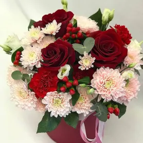 Композиция с розами «Фантазия» — это элегантное сочетание ярких и нежных цветов, создающее настроение романтики и радости.