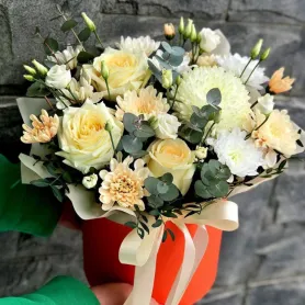 Композиция с пионовидными розами и эустомой «Рассвет»