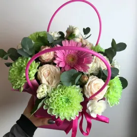Композиция «Красота» сочетает в себе яркую герберу, изящную кустовую розу, элегантный эвкалипт и хризантему, создавая насыщенный и гармоничный букет.