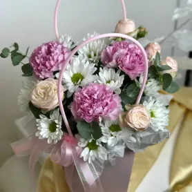 Композиция «Нежные лепестки» — это изящное сочетание диантусов, кустовых роз, хризантем и эвкалипта, создающее ощущение свежести и гармонии.