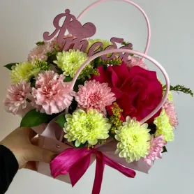 В сочетании яркой розы с нежной гвоздикой и пышной хризантемой кустовой она создаст атмосферу любви и тепла. Украшенная свежей зеленью, эта букет-композиция станет отличным подарком для любого повода.